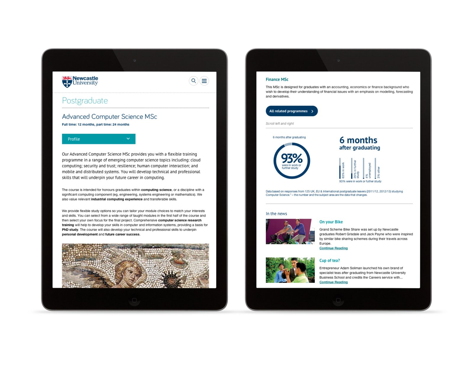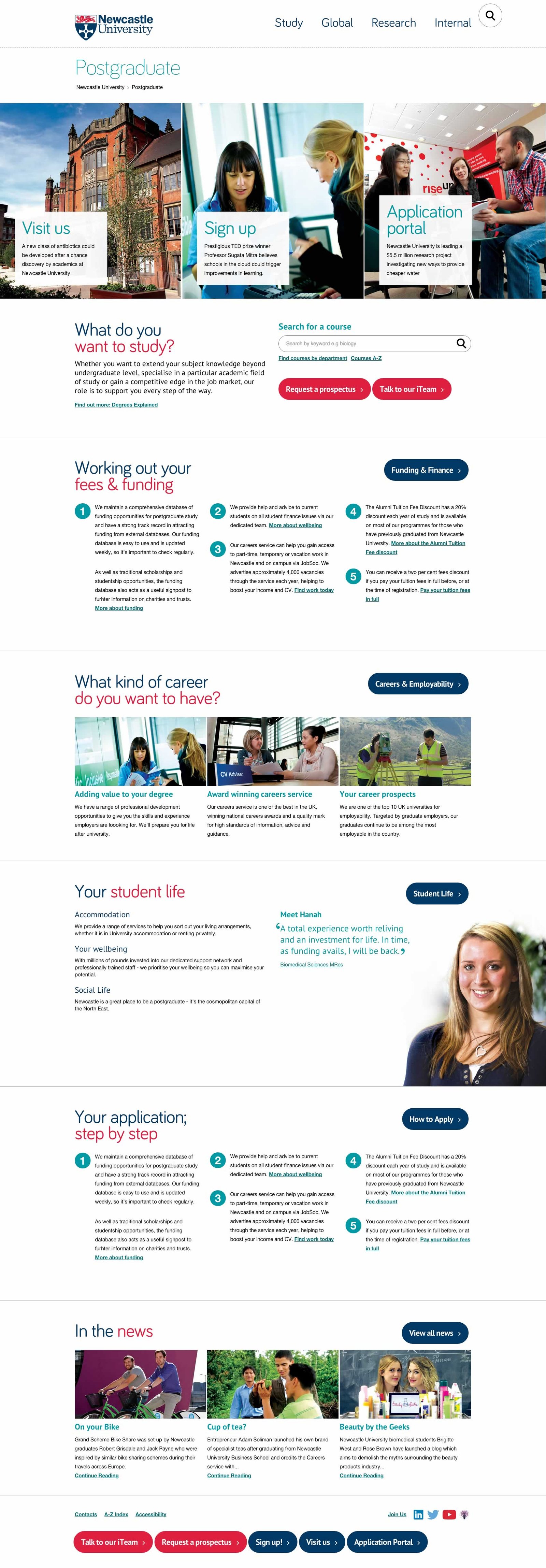Newcastle University commissioned The Roundhouse to design and develop a set of responsive templates for the public facing postgraduate site, in response to both mobile and tablet usage increasing significantly on the site.